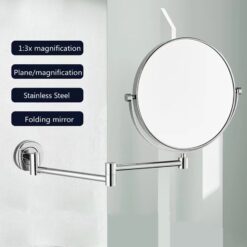 - Thanks to its wall-mounted design, the mirror is easily adjustable to accommodate your preferred viewing angle. It includes a swivel arm that allows you to move the mirror closer or farther away, tilt it up or down, and rotate it as needed for convenient use.